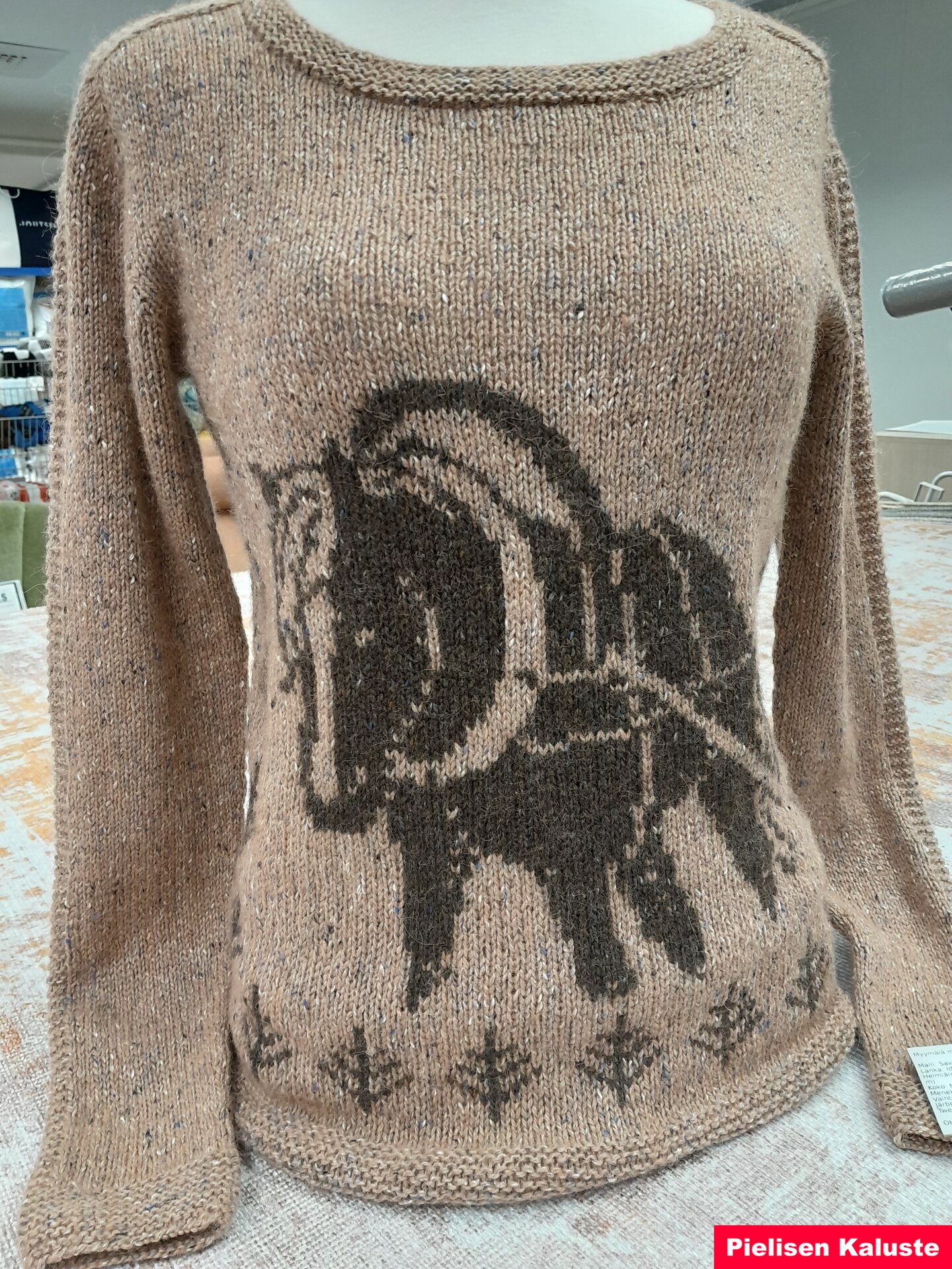 Neuleen etukappaleelle neulotaan läsipäinen suomenhevonen luokkivaljaissaan, takakappaleella toistuvat rytmikkäät havukuviot. Langaksi valikoitui värjäämätön suomenlampaan villa lähikehräämöstäni.