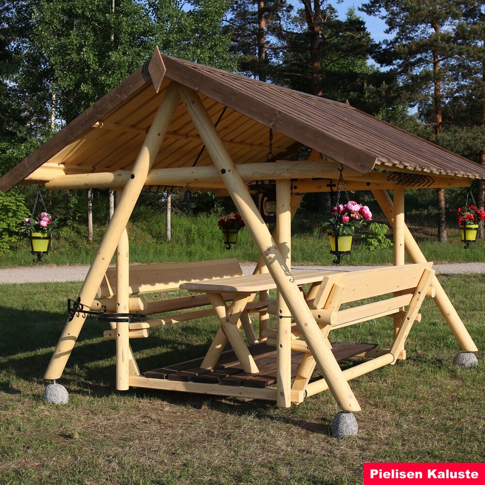 4 betonijalkaa, lautakatto tai huopakaton aluslaudoitus, harjan tukiraudat 2kpl, koukut keinun pysäyttämistä varten 2kpl ja 8 kpl taotut tulpat.